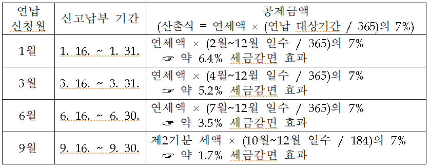 ▣ 내용 : 자동차세 납세의무자(자동차 소유자)가 연세액을 한꺼번에 납부(연납)하려는 경우 연세액에서 연납 대상기간의 이자율(7%)을 반영한 금액을 공제하여 신고납부할 수 있음